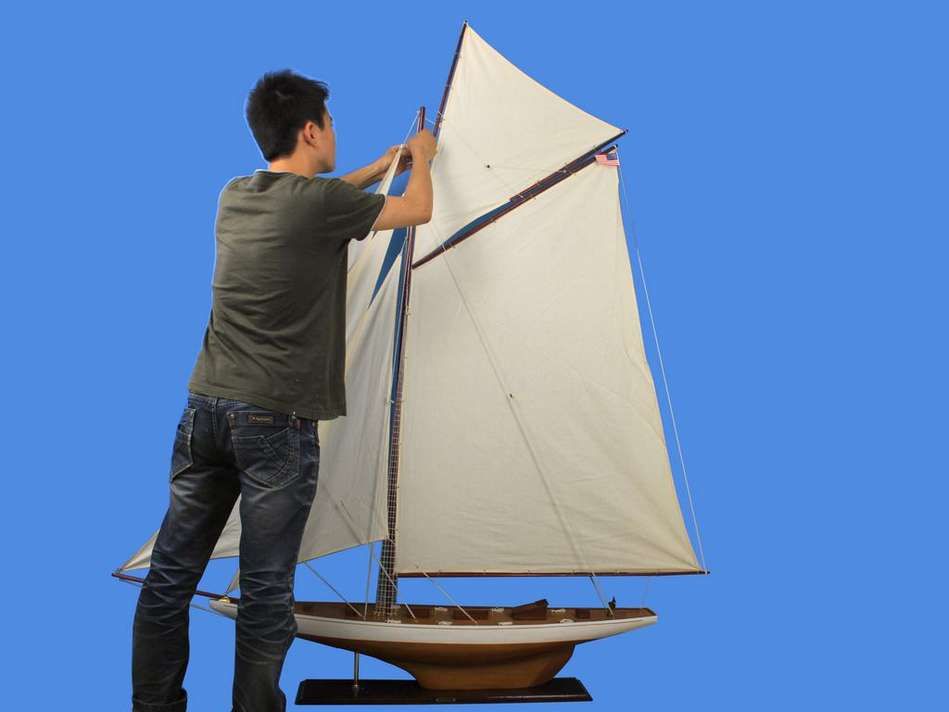 Clean lines and simple, elegant detailing define this proud Columbia yacht model. Prominent enough to set a nautical tone yet subdued to match every décor, this fine sailboat is ready to grace any room with her presence.