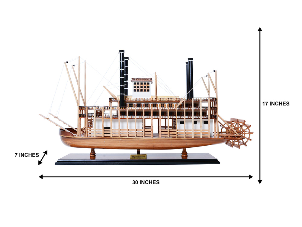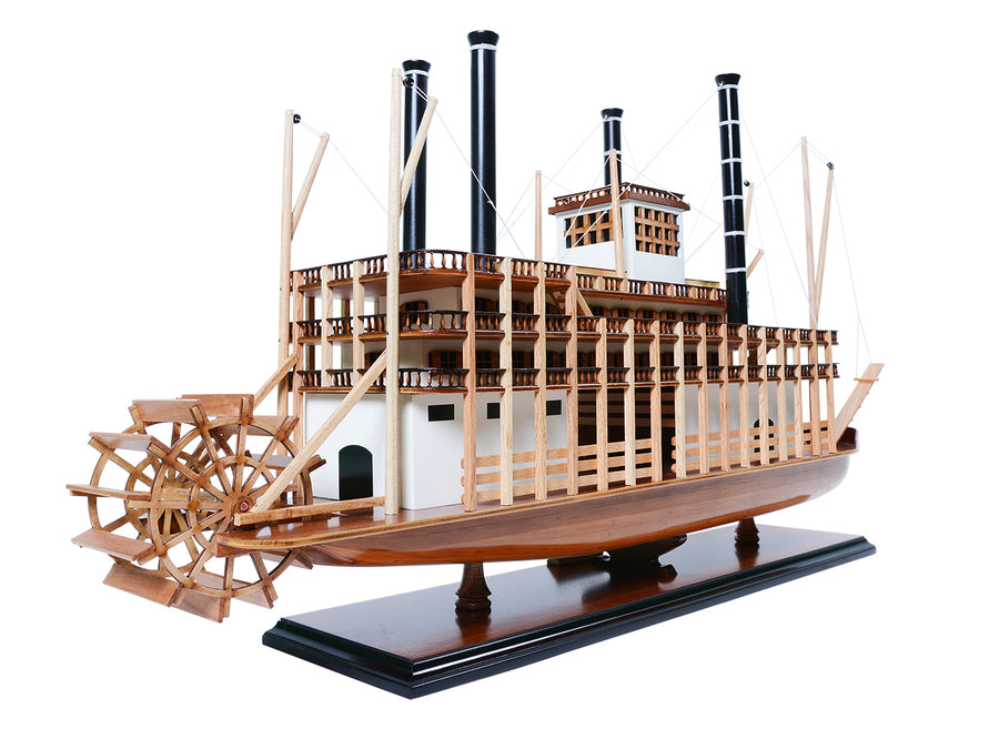 The King of Mississippi was a famous steam powered boat that sailed throughout the Mississippi River. This boat was featured in Mark Twain’s novels Tom Sawyer and Huckleberry Finn. It is now available as a FULLY ASSEMBLED model ready to be proudly display as a piece of history. Master craftsmen handcraft these highly detailed wood models from scratch using historical photographs, drawings and original plan. They are built to scale with high-grade wood such as: western red cedar, rosewood, and mahogany. They are 100% hand built individually using plank-on-frame construction method and are similar to the building of actual ships. Each model requires hundreds of hours to finish and must go through a demanding quality control process before leaving the workshop. The King of Mississippi includes a four level deck with numerous details. You will find the wooden steam propeller on the back. There is an opening on the first deck where you can look inside the cabin. Each deck floor has its own stair to lead you up or down. The railings are made out of metal that can be seen on each floor. Four black smoke stacks are on the third and fourth deck. The model is secured tightly on a solid wooden base with a brass nameplate. It’ll make a perfect gift for home or office decorator, boat enthusiast, or passionate collector. |