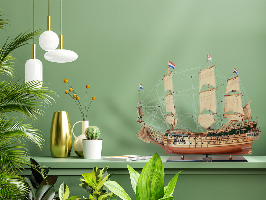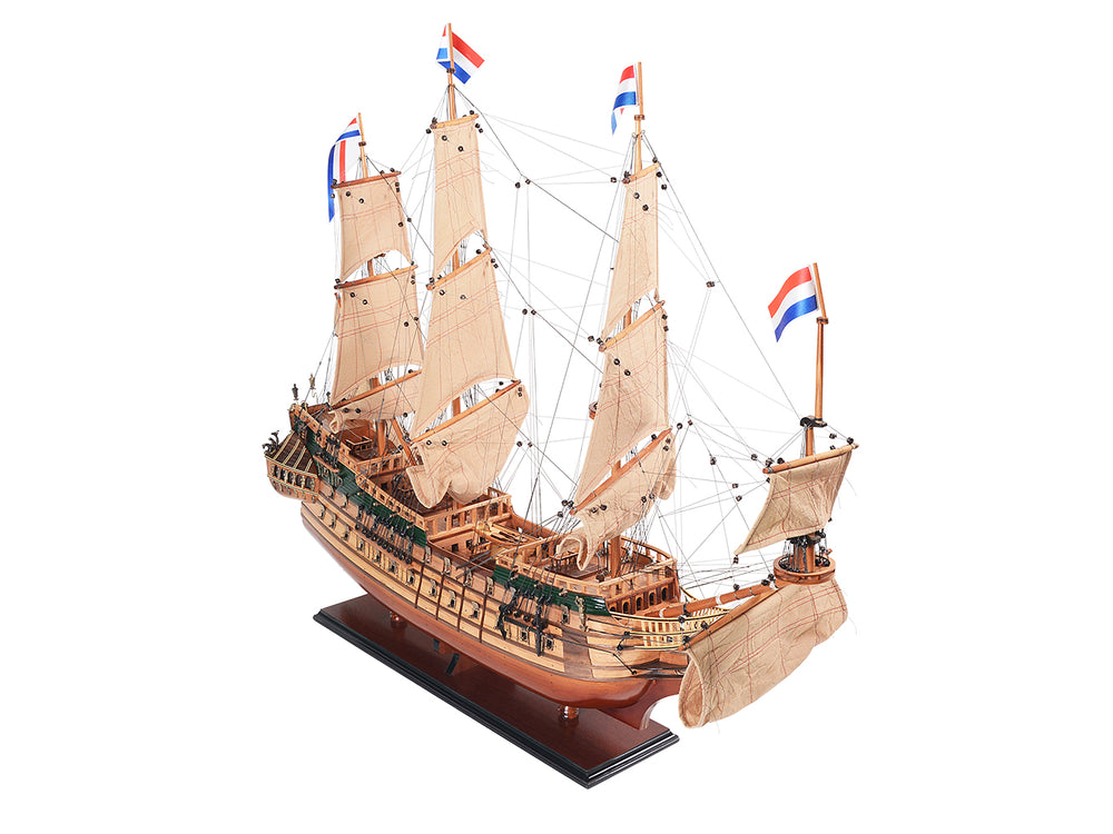 Display this “The Friesland Dutch Ship” right in your own home or office! The Friesland was a second rank vessel with 80 guns built around 1663, is available as a museum-quality, FULLY ASSEMBLED model. Master craftsmen using historical photographs, drawings or original plans meticulously handcraft these highly detailed wood models from scratch. They are built to scale with high-grade wood such as: western red cedar, rosewood, and mahogany. They are 100% hand built individually using plank-on-frame construction method and are similar to the building of actual ships. Each model requires hundreds of hours to finish and must go through a demanding quality control process before leaving the workshop. This Friesland model has distinctive two tone colors wood on the hull. It also features plank on frame, three decks, and two rows of ferocious cannons on each side of the ship. The front bowsprit and three large masts are connected securely using advanced rigging and lines painstakingly knotted and fastened by hand. Each yard has an attached hand-stitched unfurled sails made of fine linen. Metal anchors and a wooden rudder are visible on the front and rear of the ship. On the deck, there are stationed cannons, an authentic hand-built lifeboat with ribs and planks, wooden cabin, and many other handcrafted ornaments. There is also an exquisite detailed admiral’s quarter on stern with beautiful handcrafted metal lanterns, statues, and ornaments. This model comes standard with a solid wood base and brass nameplate. It’ll make a perfect gift for home or office decorator, boat enthusiast or passionate collector. |