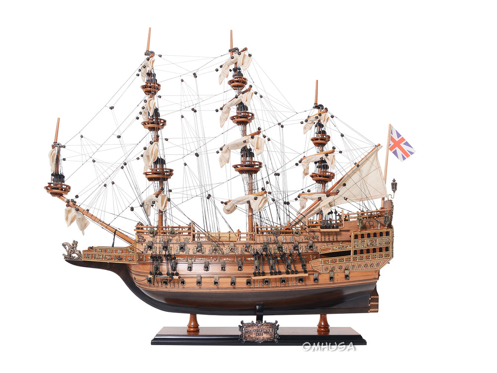 This is museum-quality, FULLY ASSEMBLED replica of H.M.S. Sovereign of the Seas, a first-rate ship in the British Royal Navy for more than 50 years in the 1600s. Each one has a unique serial number etched into the hull, which allows us to identify production date, material used and all other production information of a model. Master craftsmen using historical photographs, drawings or original plans meticulously handcraft these highly detailed wood models from scratch. They are built to scale with high-grade wood such as: western red cedar, rosewood, and mahogany.
